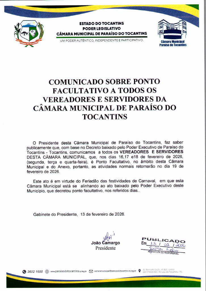 A Câmara Municipal de Paraíso do Tocantins informa à população que, em razão do período de Carnaval, será adotado ponto facultativo nos dias 16, 17 e 18 de fevereiro de 2026.